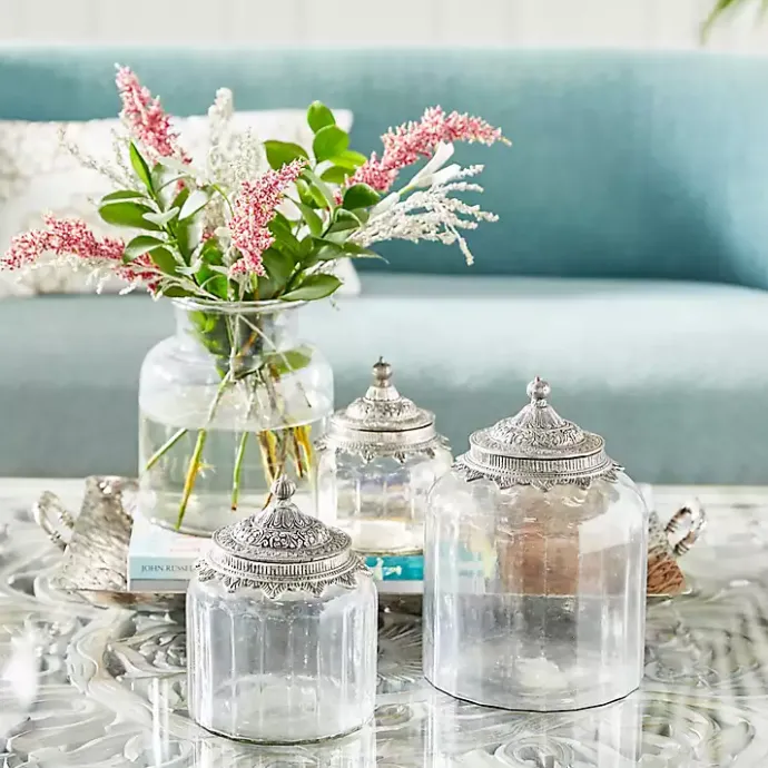 These Clear Glass Jars with Decorative Lids will make an ornate accent in your home. Use them for some beautiful storage in any space, from the bathroom to the kitchen!