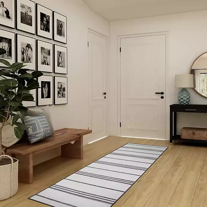 With its simple, modern design this Gray and White Stripe Washable Runner will instantly update your space. Its neutral tones are ideal for a variety of decor styles!