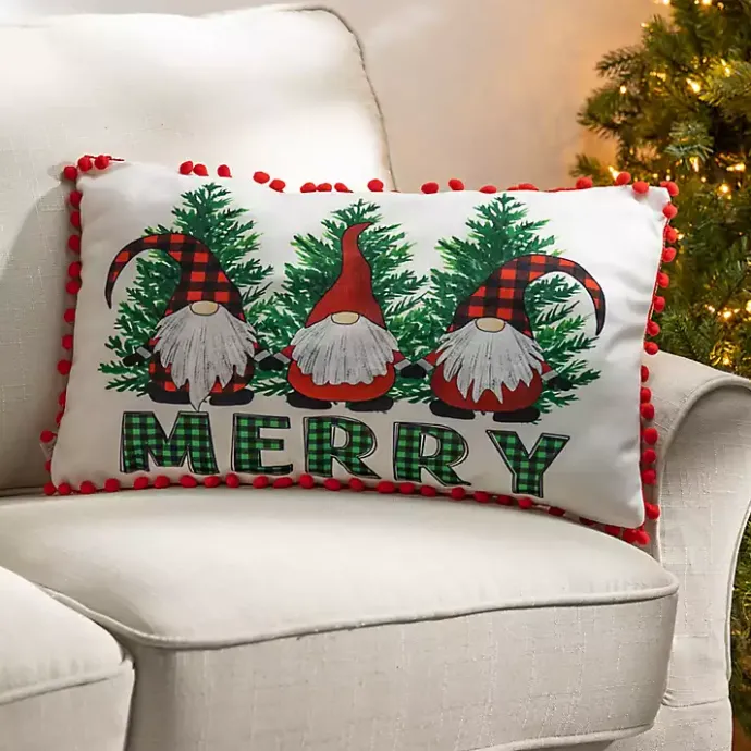 - First pillow features the word “Merry” with buffalo check pattern gnomes