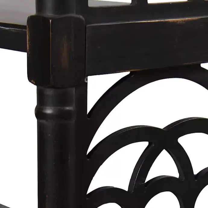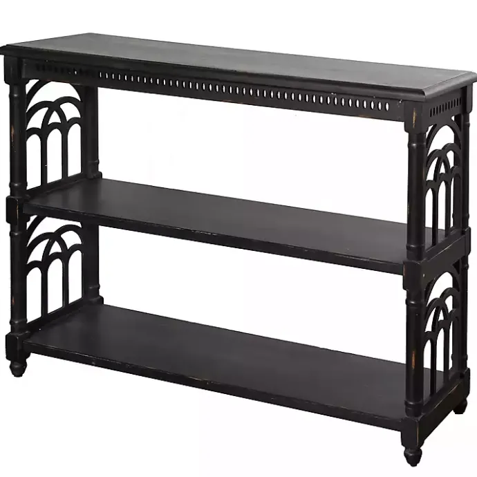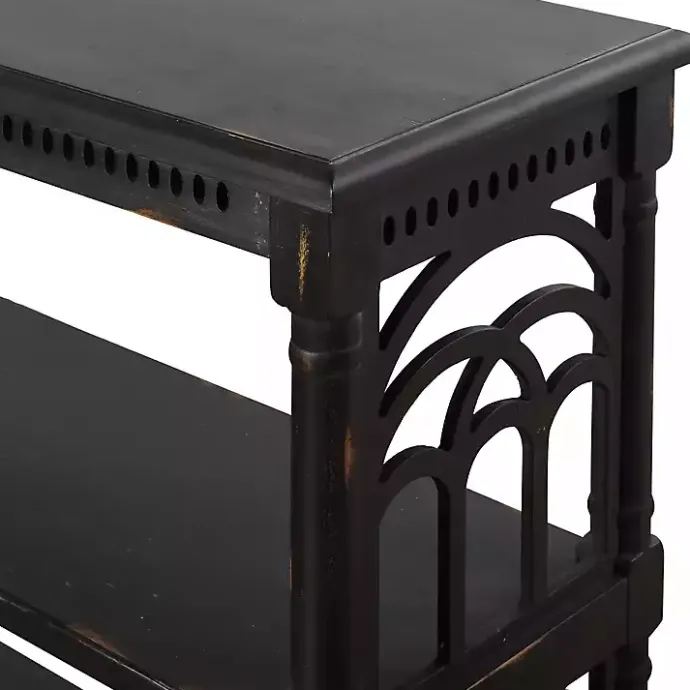This Black Open Shelf Cathedral Ends Console Table features an open back and ornate side design. You’ll love the stylish and rustic addition it makes to your home storage.