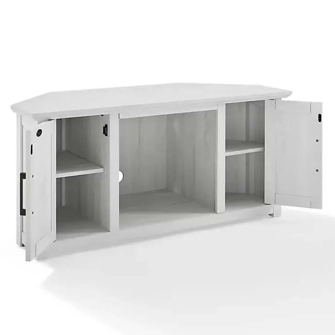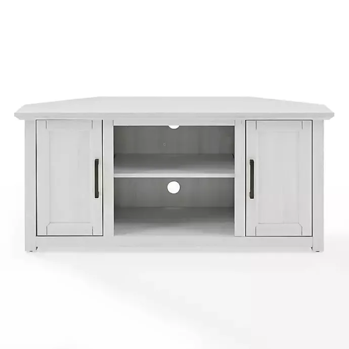Our Rustic White Katy-Corner TV Stand will neatly fill out any corner! This TV stand features storage space and is ideal for smaller bedrooms or living rooms.