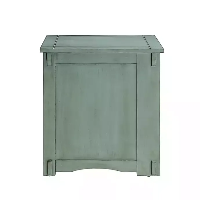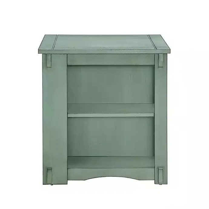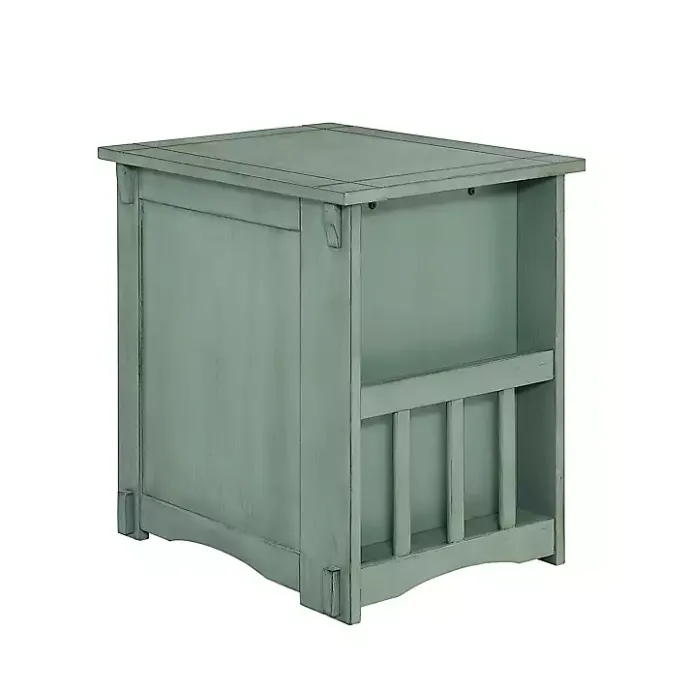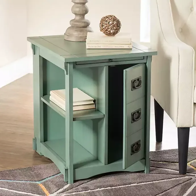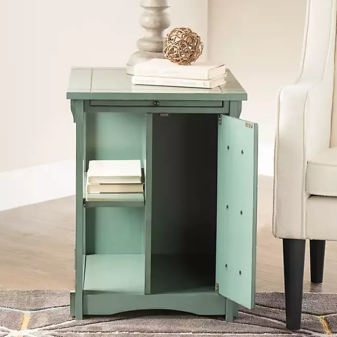 Meet the Teal Wood Parnell Storage Accent Table, featuring abundant storage and utility with a pop of color! Faux front drawers act as a cabinet door, while a pull-out shelf and a magazine rack on the back make the table even handier.
