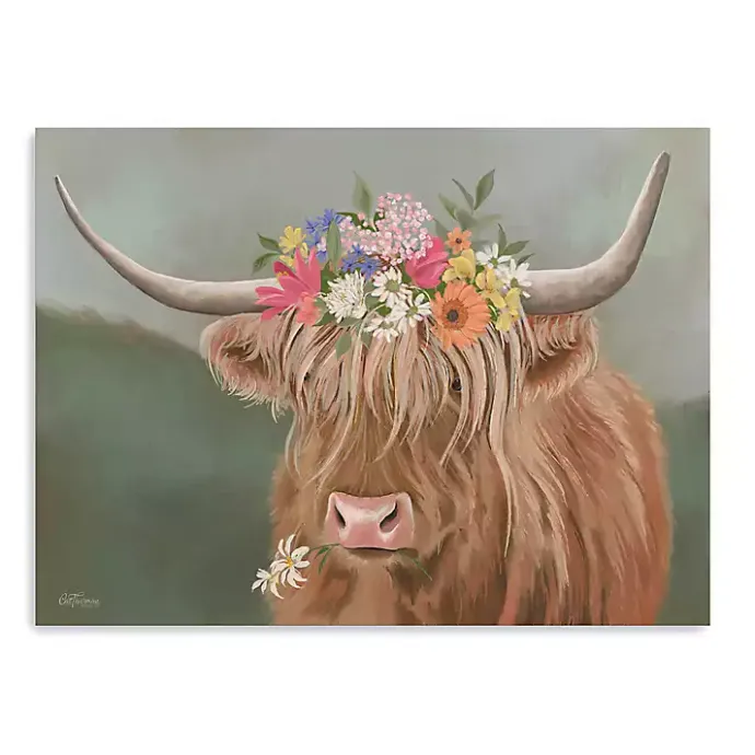 Our Daisy Mae Cow Canvas Art Print features an adorable Highland cow wearing a pastel flower crown. This cute canvas would make a lovely addition to any child’s room.