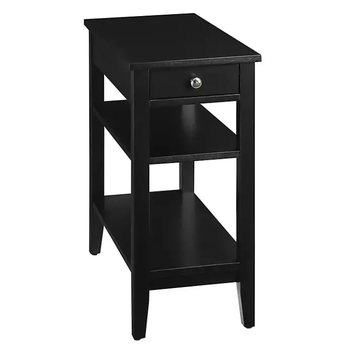 With a sturdy construction and a classically simple design, this Black Double Shelf Wood Accent Table will be the perfect addition to your living room or bedroom. Plus, with two shelves and a drawer, it provides ample storage space!