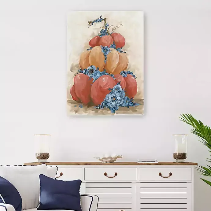 Incorporate some seasonal charm into your wall decor with this Floral Pumpkin Stack Canvas Art Print. Its whimsical pumpkins will add the perfect fall touch to any space!