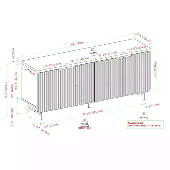- Cabinet measures 69L x 17.75W x 28.75H in.