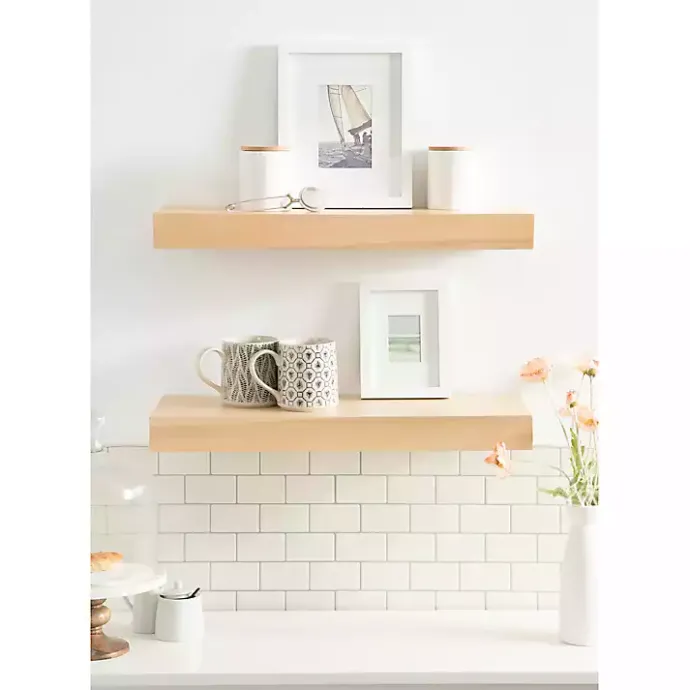 Our Natural Wood Floating Shelf Set is perfect for displaying your favorite things with a clean look! The natural finish and sleek lines will elevate any room in your home. Pair these shelves side by side or stacked for a natural, organic aesthetic!