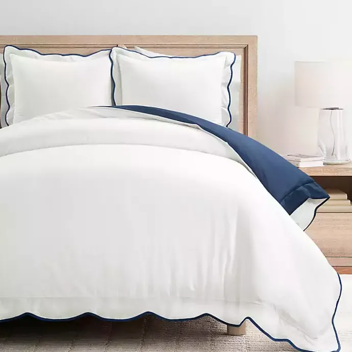 The quaint style of this Navy Scallop Edge 3-pc. Full/Queen Duvet Cover Set will give your bedroom a lovely refresh. Its light tones and scalloped detailing are perfect for coastal or cottage decor!