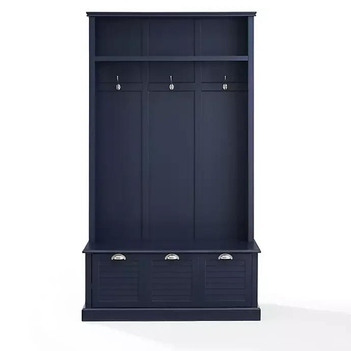 Add storage to your entryway or mudroom with this Navy Wood Storage Bench Hall Tree. Its hooks and drawer make is easy to keep everyone’s coats and shoes organized. Plus, it provides a a convenient seat!
