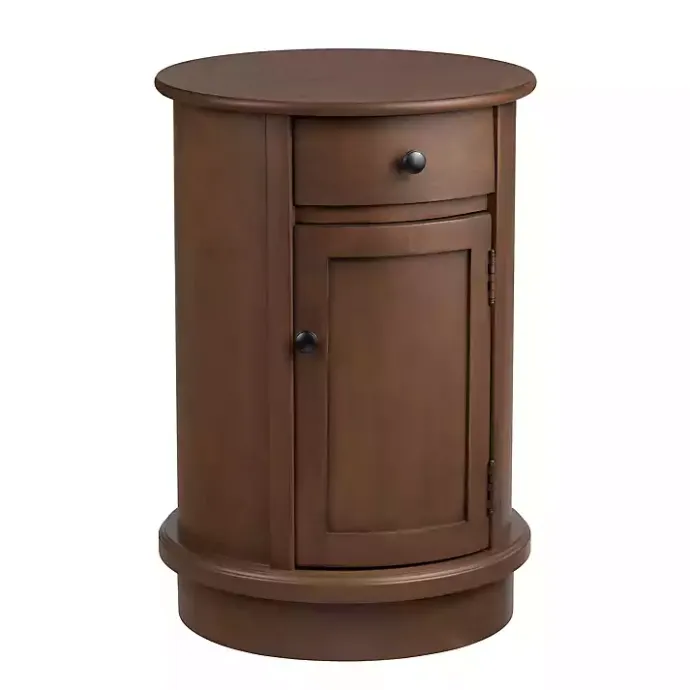 The Round Brown Beckly Accent Table flaunts a timeless look that will complement a wide variety of home styles. The interior shelves and single drawer offer ample space to store living room accessories.