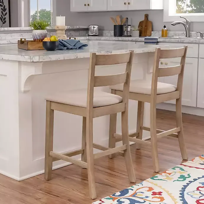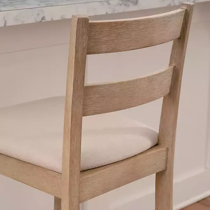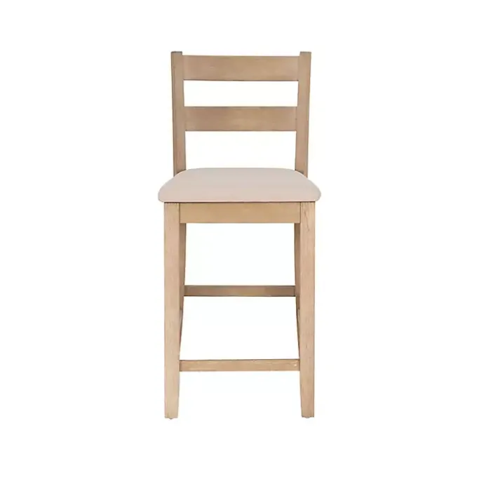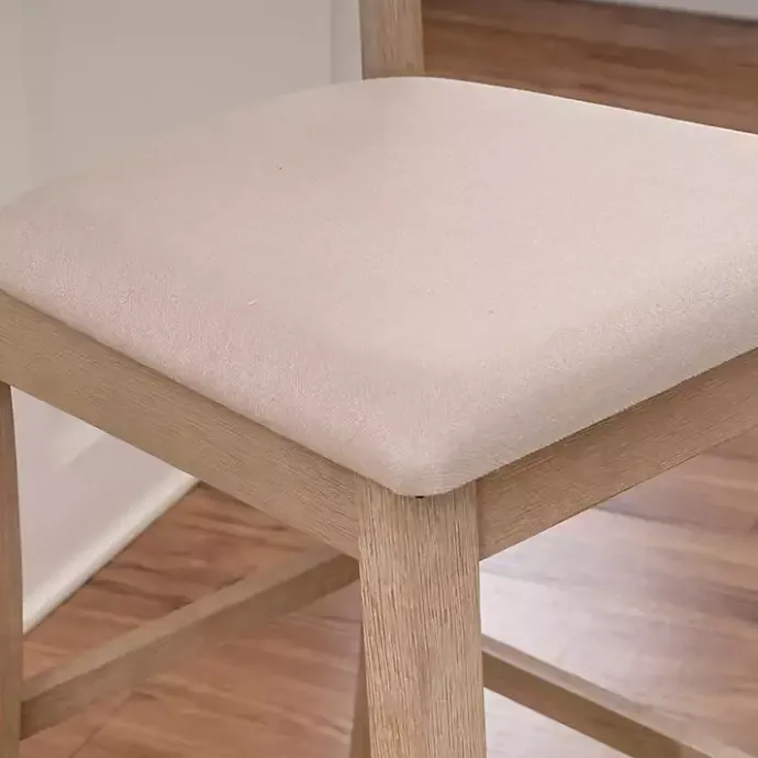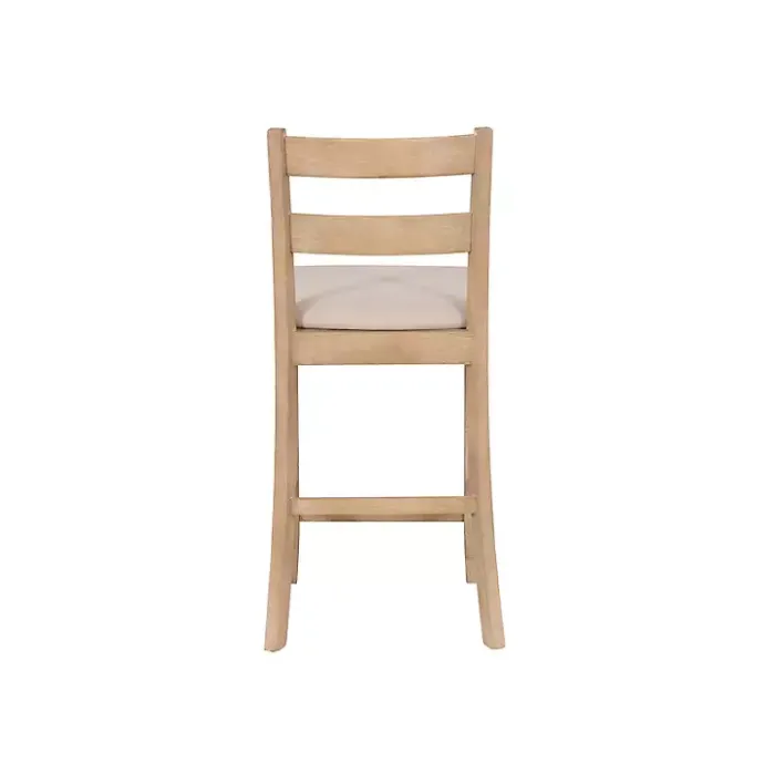 This Rustic Graywash Wood Upholstered Counter Stool features simple yet elegant details, like its ladder back design, rustic finish, and flared legs. Solid wood construction and quality craftsmanship make this a stylish and sturdy seating option for your dining area!