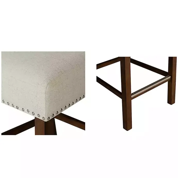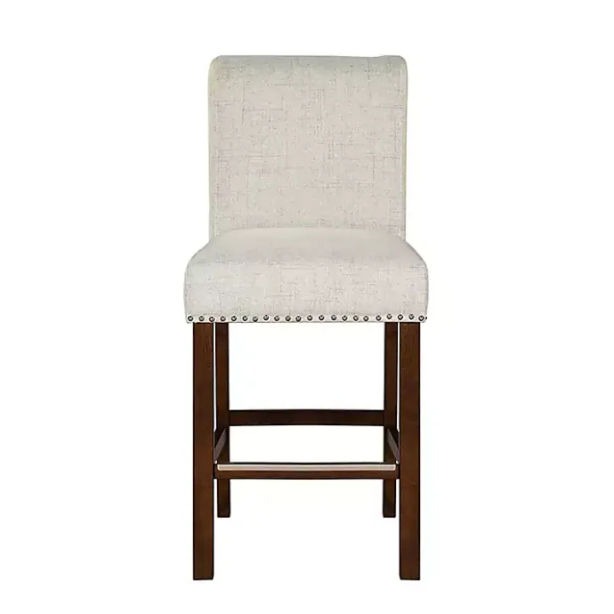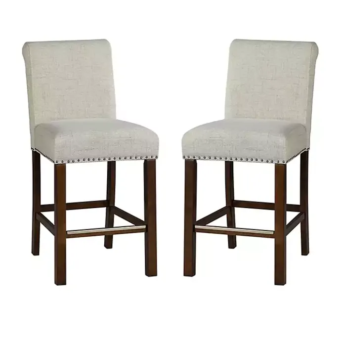 Embrace elegance with this Aubrey Natural Upholstered Counter Stool Set! These stools feature a transitional style, with their roll back design and silver nailhead trim. Plush seats, solid wood frames, and metal kickplates ensure long lasting comfort and durability.