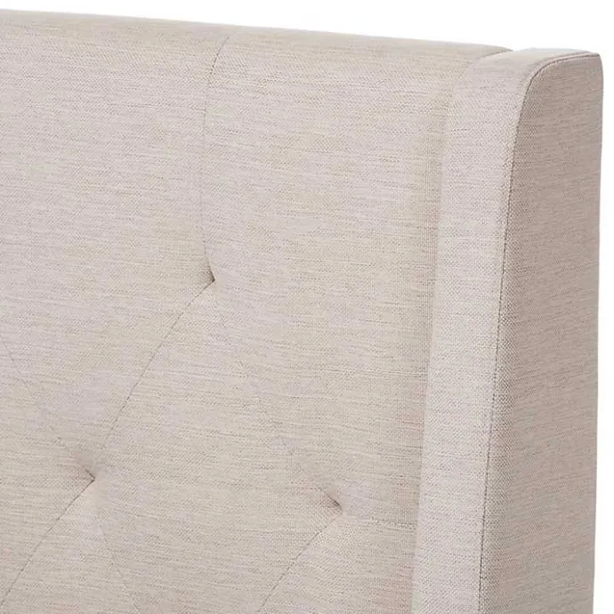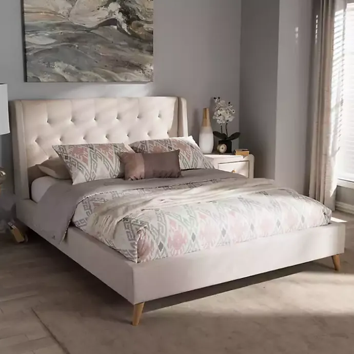 Bring elegant style into your bedroom with this Beige Upholstered Wingback Queen Platform Bed. Its button tufted design gives off a regal look. You’ll love how its light beige finish looks in any room!