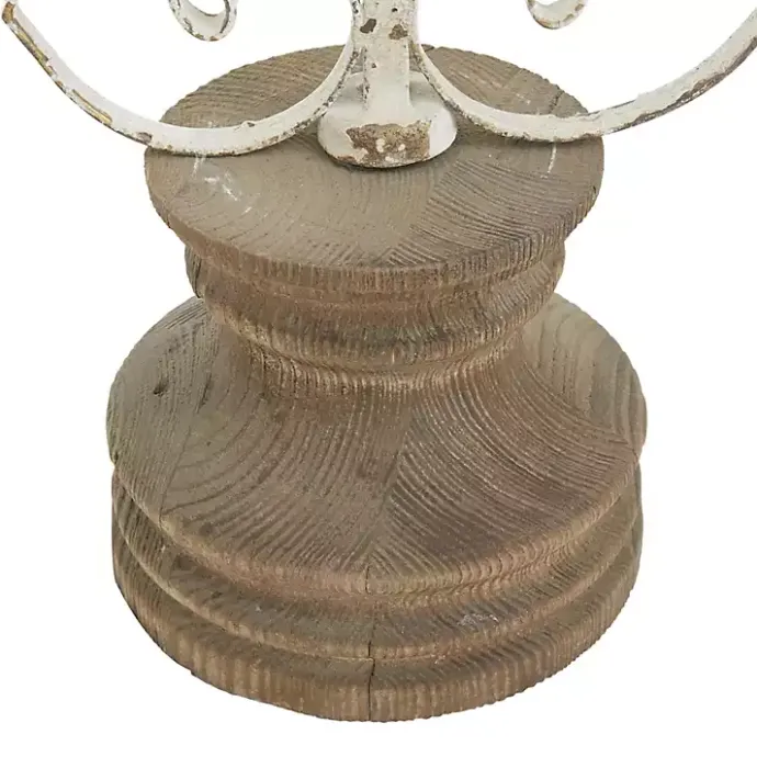 - Distressed cream metal finish with matte brown wood base
