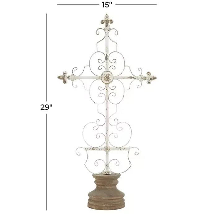 You’ll love the antique and elegant look of this Cream Metal Ornate Cross Tabletop Sculpture! This cross is accented with scroll details and fleur-de-lis for a French country-inspired touch.