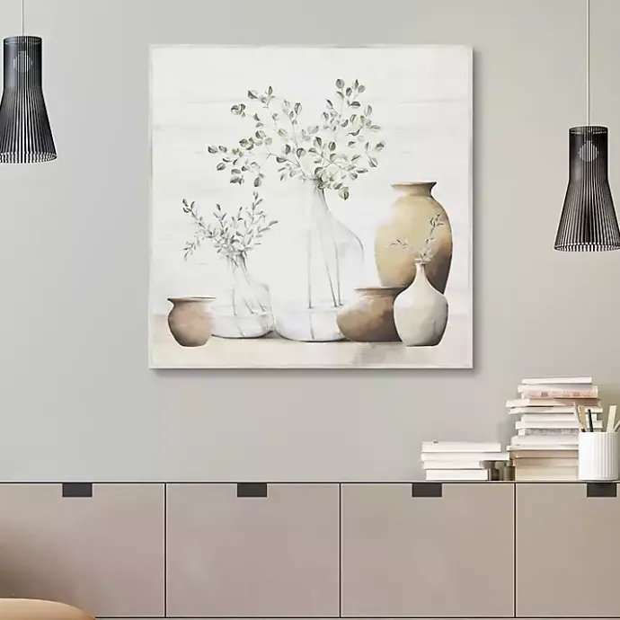 The Sage Dreams Framed Canvas Art Print will look perfect with any neutral, modern home aesthetic. Featuring botanical sprigs and an assortment of vases, it has a calming effect in any space.