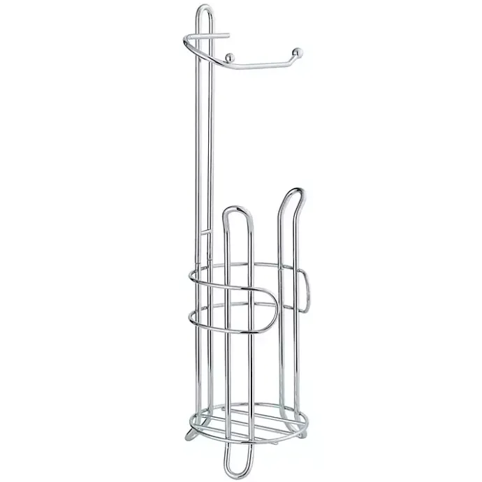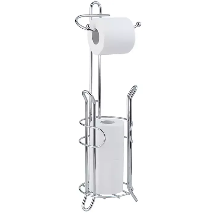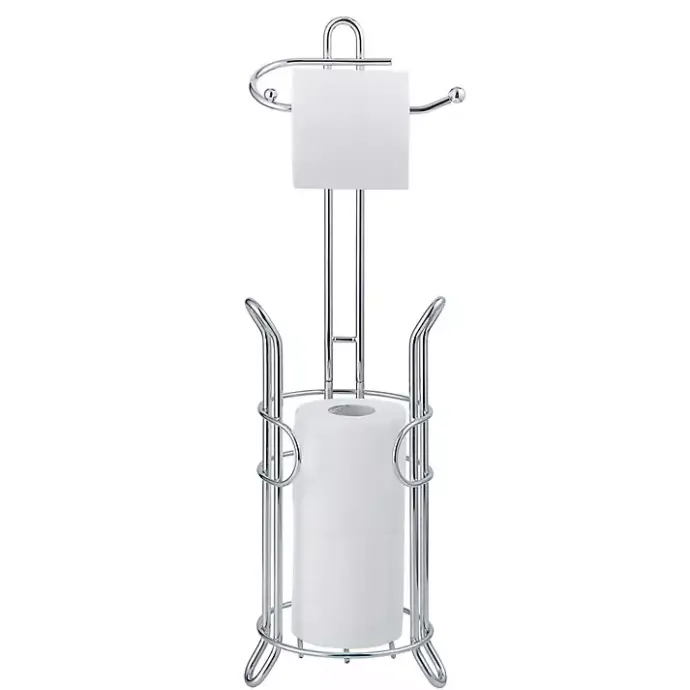 Keep your toilet paper easily accessible with this Silver Toilet Paper Storage Stand. Its simple, modern design and shiny finish will blend seamlessly with your bathroom decor!