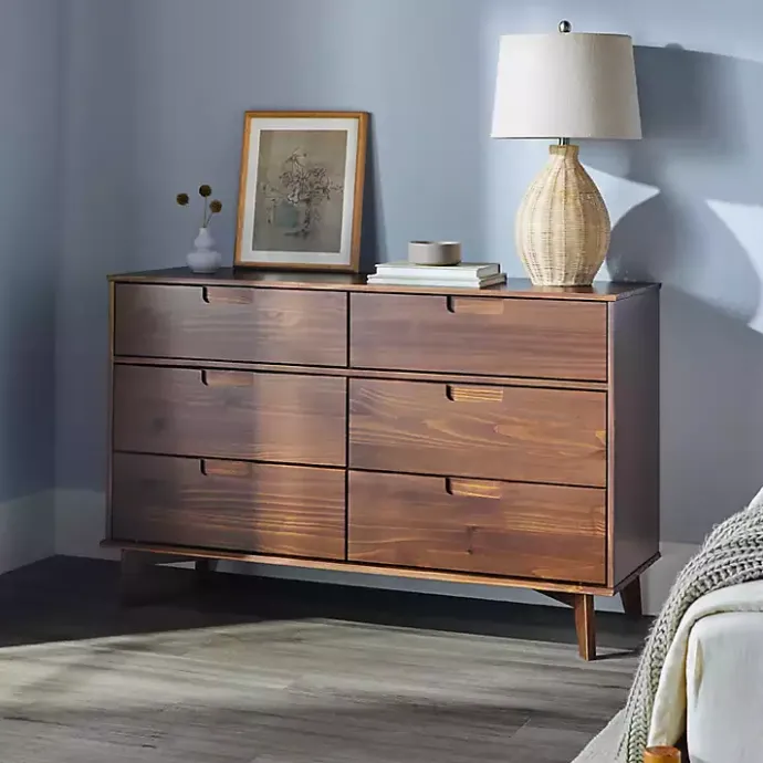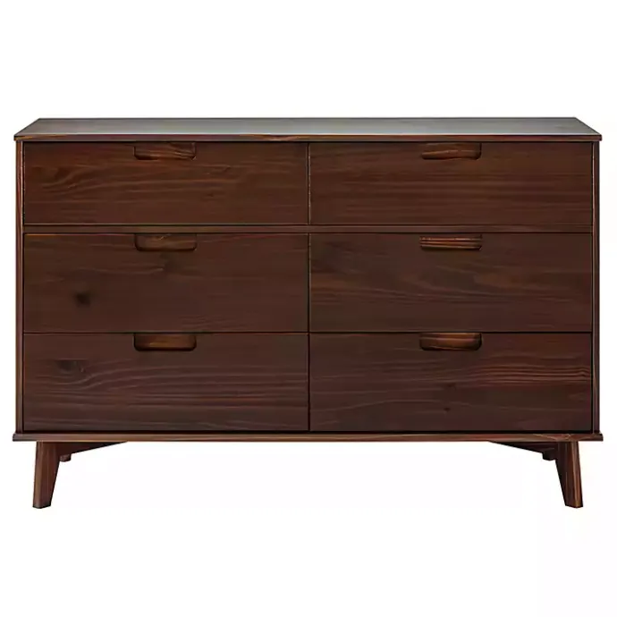 Add storage space into your bedroom with this Walnut Grooved Handle 6-Drawer Dresser! This dresser features a stylish, mid-century modern design with angled legs and cutout handles.