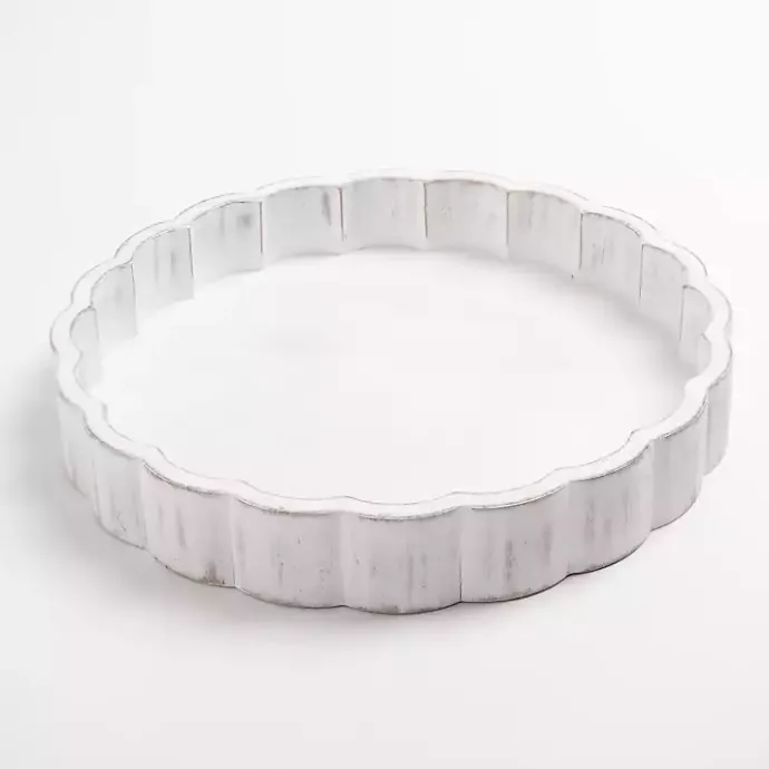 Display decor with the beautifully simple style of this Whitewashed Scalloped Wood Tray. With a light, relaxed finish, this tray will bring a subtle touch of the coast to your space!
