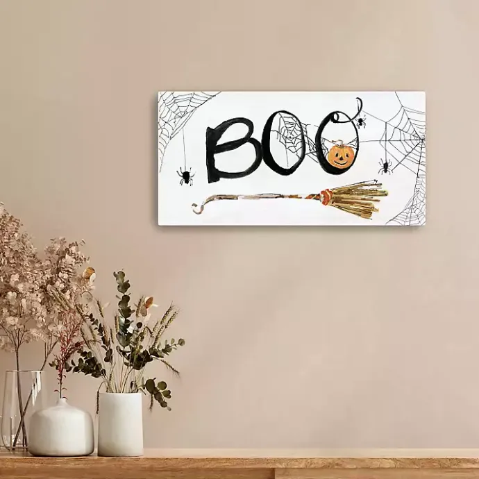 Decorate your haunted house with this Boo Broomstick Canvas Art Print. Its jack o lantern and cobweb accents will make the cutest addition to your Halloween decor!