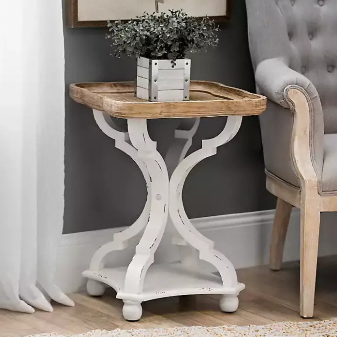 Our Corina Scalloped Accent Table is a unique rustic accent. Its scalloped natural wood tabletop pairs perfectly with its curved leg base design. Use this piece to complement your modern farmhouse décor!