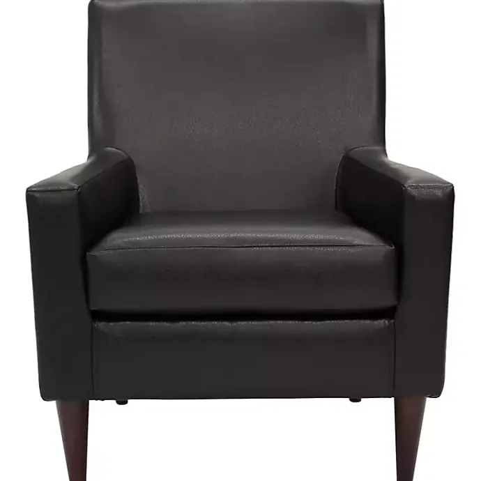 Add a hint of sophistication to your home with this Emma Black Faux Leather Accent Chair. Featuring classic design that is elevated by clean, modern lines, this chair will bring beautiful style and comfort to any space!