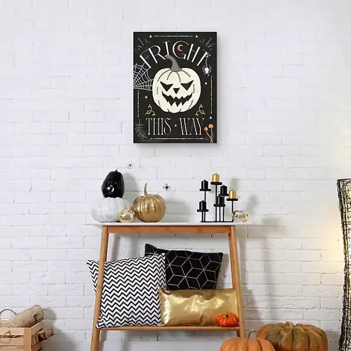 Invite the spirits of Halloween into your home with this Fright This Way Canvas Art Print. The friendly Jack o lantern is sure to haunt your home this spooky season!