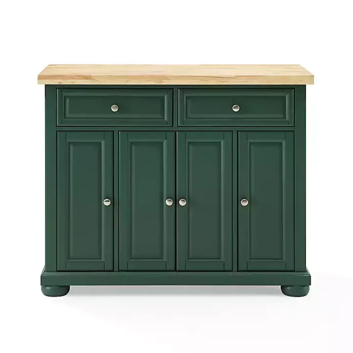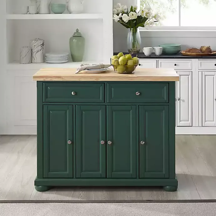 Turn your kitchen into a more practical space with this Gia Forest Green Wood Kitchen Island! Featuring an earthy finish and optional castor wheels, this design is both stylish and useful.