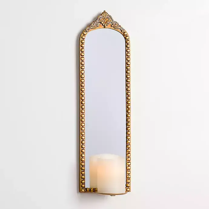 Elevate the ambiance in your home with this Gold Ornate Beaded Mirror Wall Sconce. Its stunning design will add a touch of elegance to your living room or entryway!