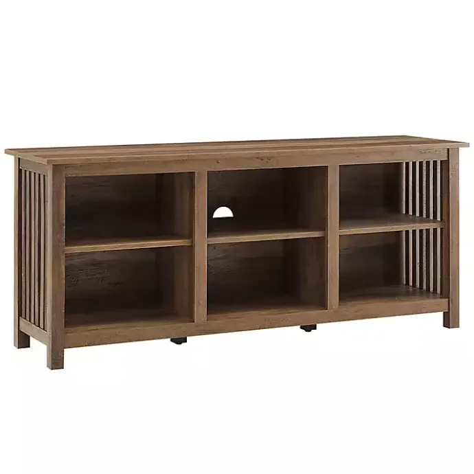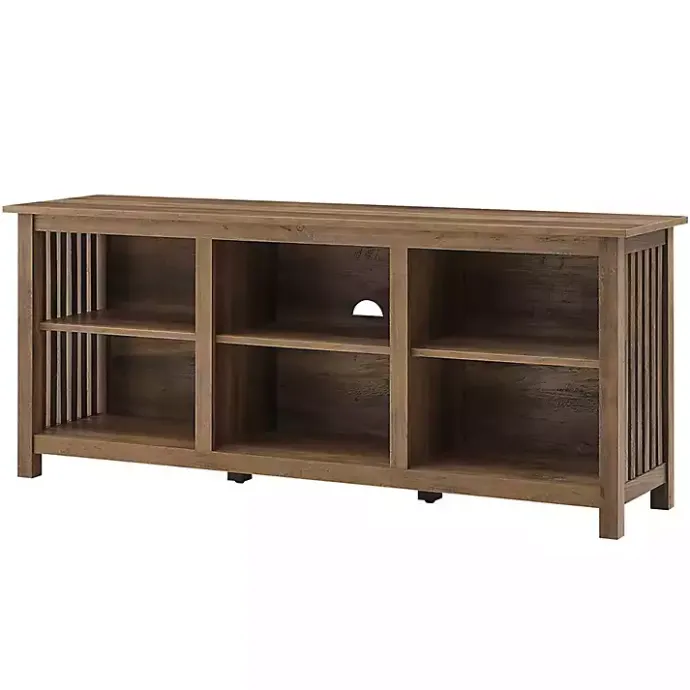 Entertain in traditional mission style with this Rustic Oak Wood Slatted Sides Media Cabinet. The six spacious cubbies are perfect for storing books or displaying home décor. Keep your tech nice and tidy with the cord management ports. With its versatile silhouette, this piece will remain a staple as your style evolves.