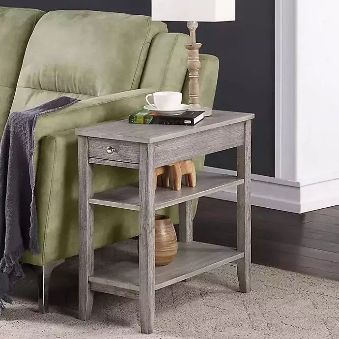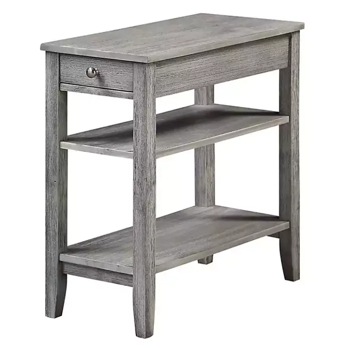 With a sturdy construction and a classically simple design, this Gray Double Shelf Wood Accent Table will be the perfect addition to your living room or bedroom. Plus, with two shelves and a drawer, it provides ample storage space!