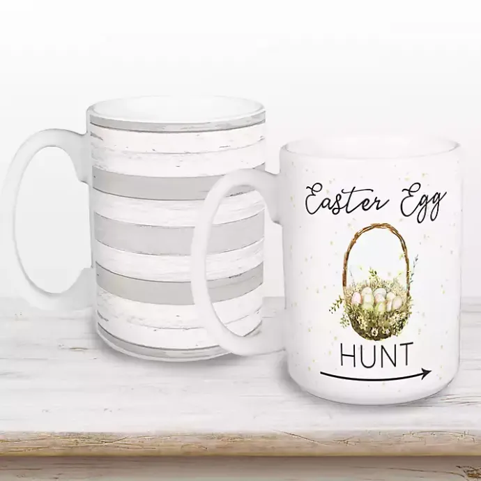 - Second mug features the phrase “Easter Egg Hunt” with a basket of eggs design