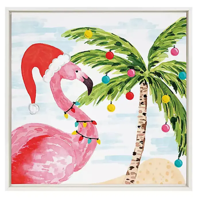 Soak up the joy of the Christmas season with this Holiday Flamingo Framed Canvas Art Print. Perfect for a coastal setting, this beach scene will transport you to the tropics!