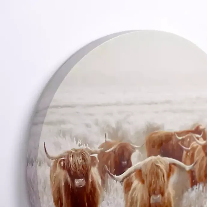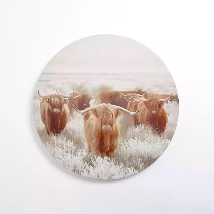 Bring a bit of winter wilderness into your home with this Round Frosty Highland Cows Canvas Art Print. Its round shape will add variety to your wall decor!