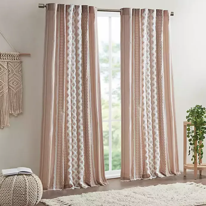 This Blush Chenille Stripe Curtain Panel offers a chic and casual update to your home. The blush window panel features a geometric print with a tufted chenille stripe trim.