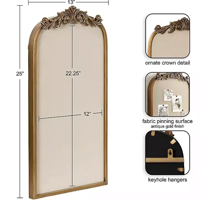 With its vintage-inspired design, this Gold Arendahl Arched Pinboard displays photos, notes, and reminders with an elegant flair! You’ll love how it adds function to your wall decor.