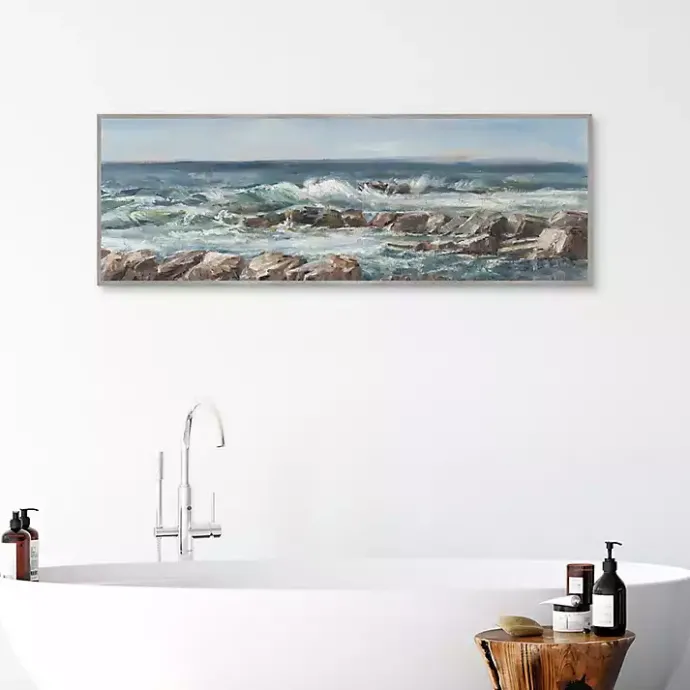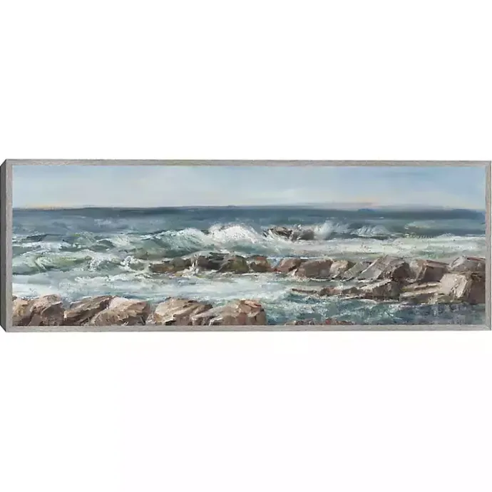 Add dramatic flair to your coastal themed room with our Moody Ocean View Framed Canvas Art Print. Featuring choppy water and stout rocks, this canvas will be sure to arrest the attention of your guests.