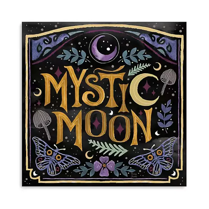 - Features the phrase “Mystic moon” with moth and botanical accents