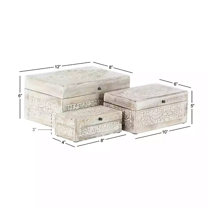 These Whitewashed Floral Carved Wood Boxes are a decorative way to store all kinds of things! Their soft, white finish and lovely floral design will look great anywhere.