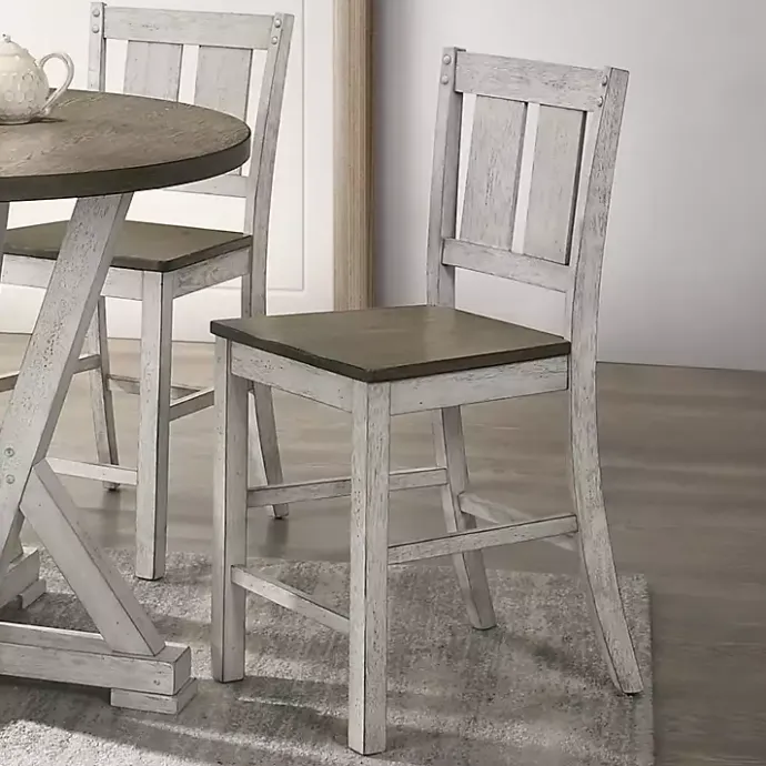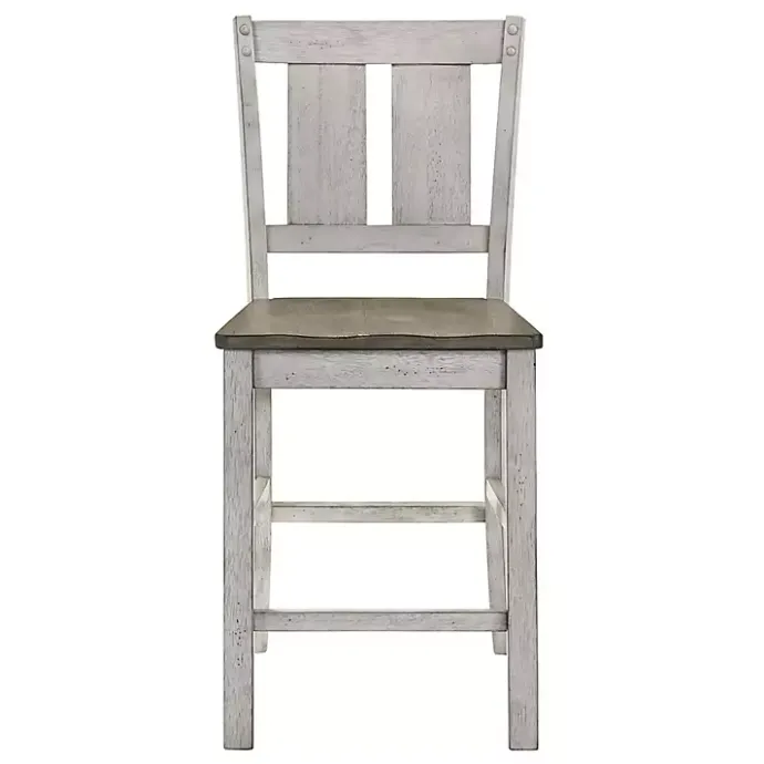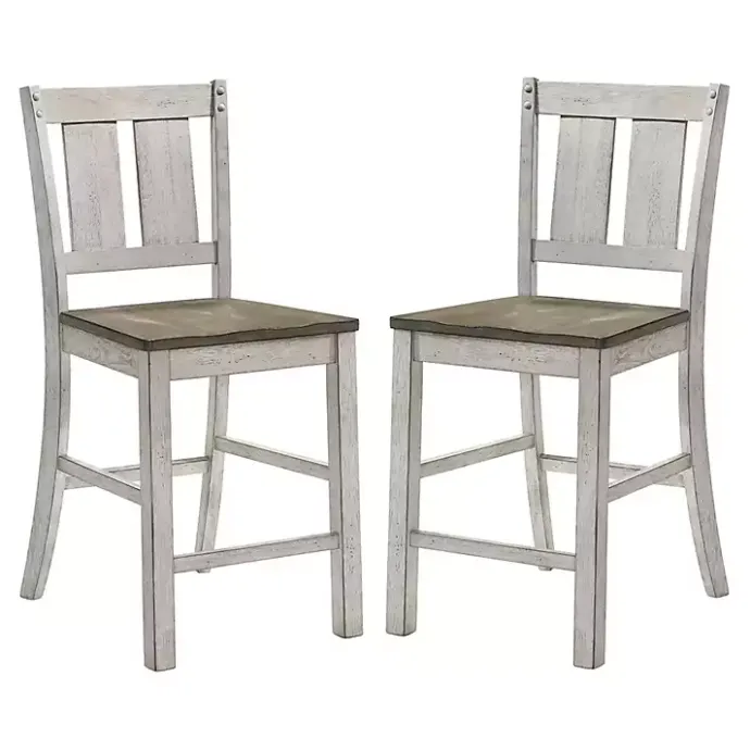 The Antique White & Ash Brown 2-pc. Counter Stool Set will look perfect in your country-inspired dining room. The two tone finish, plank style backs, and nailhead trivets blend into the bold, rustic look.