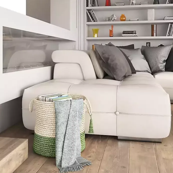 Store those random blankets, toys, or shoes in our Green and Cream Woven Basket with Tassel! You’ll love the woven texture and decorative tassel on this basket.