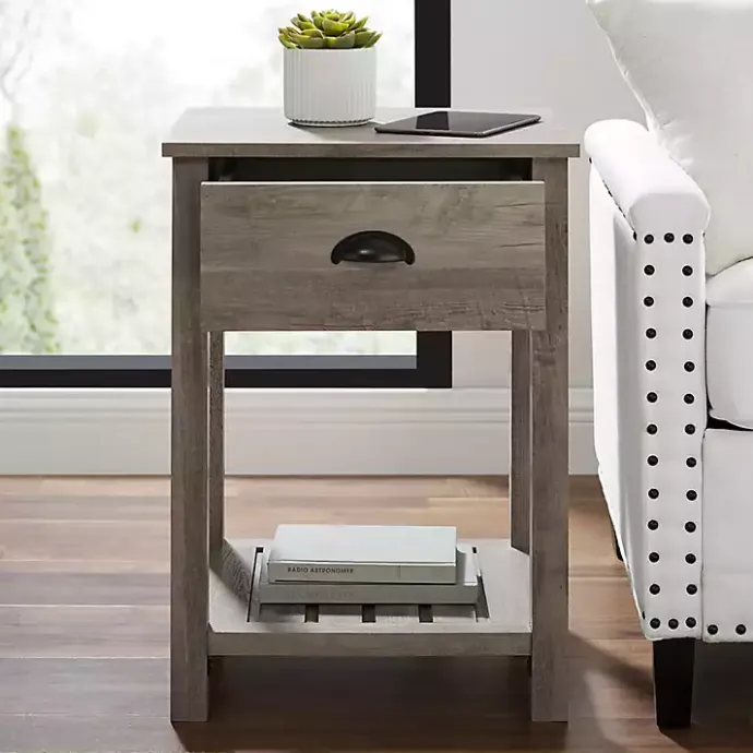 Whether you’re looking to keep things quaint and cozy or simply organize your home, this Gray Wash Country Accent Table will satisfy your design desires! The single top drawer with a cup handle features telescoping metal drawer glides for convenient closed storage. The lower slat-style shelf creates an open storage space while infusing farmhouse style. Use this accent table in the living room or home office for some sneaky storage. Pair with the matching entry table to make a complete set in your home!