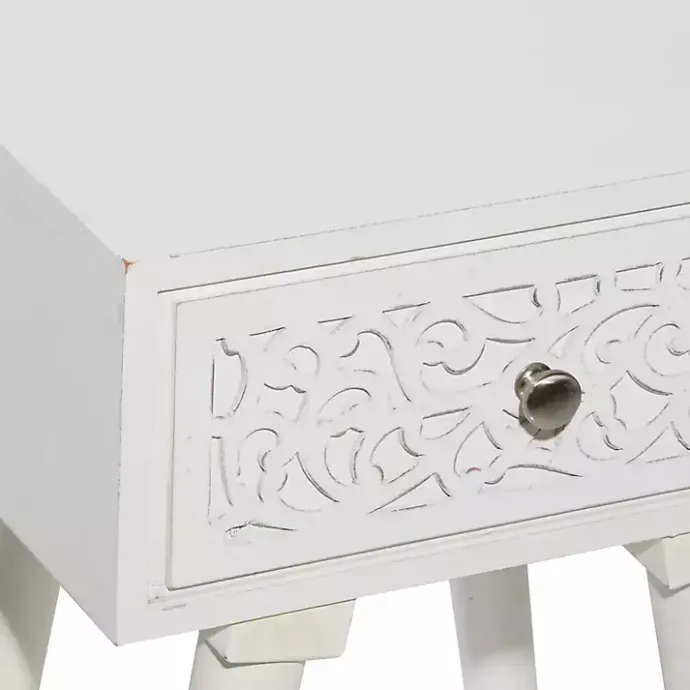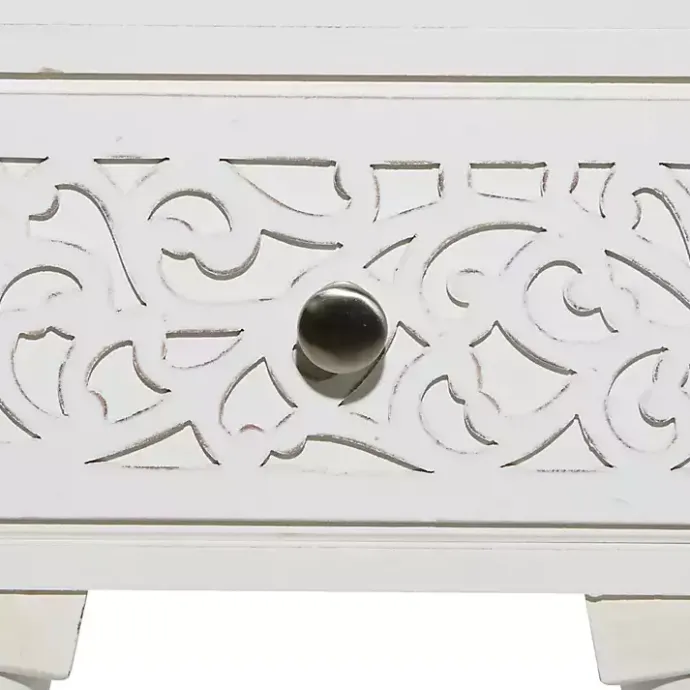 Update any farmhouse or boho setting with this White Wood Carved Drawer Accent Table. The intricate, scroll carved design will add an elegant touch to your décor.