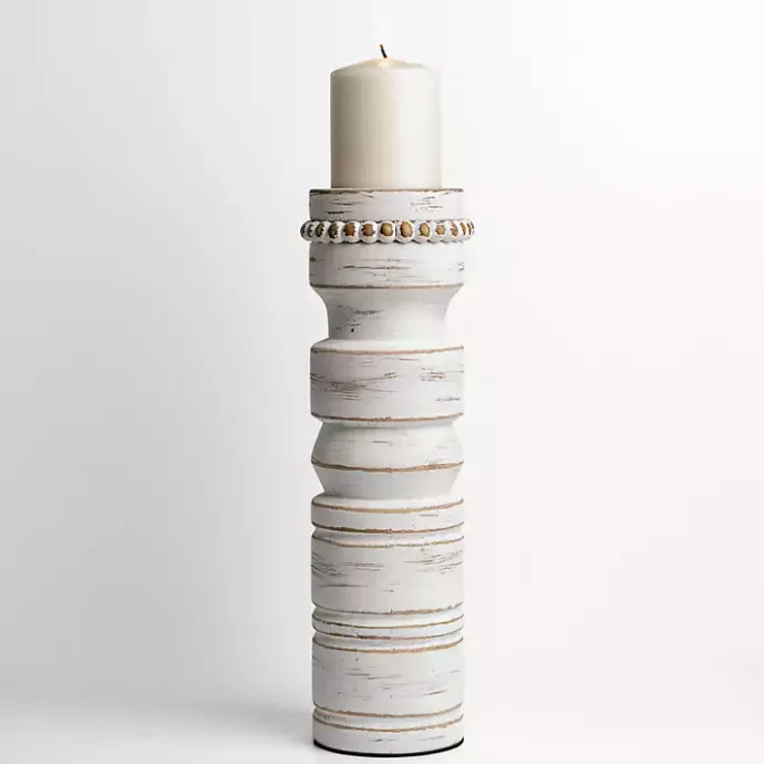Give your candle an extra flair with the White Beaded Wood Pillar Candle Holder. Its distressed white finish combined with carved accents make it a great accent for any space!
