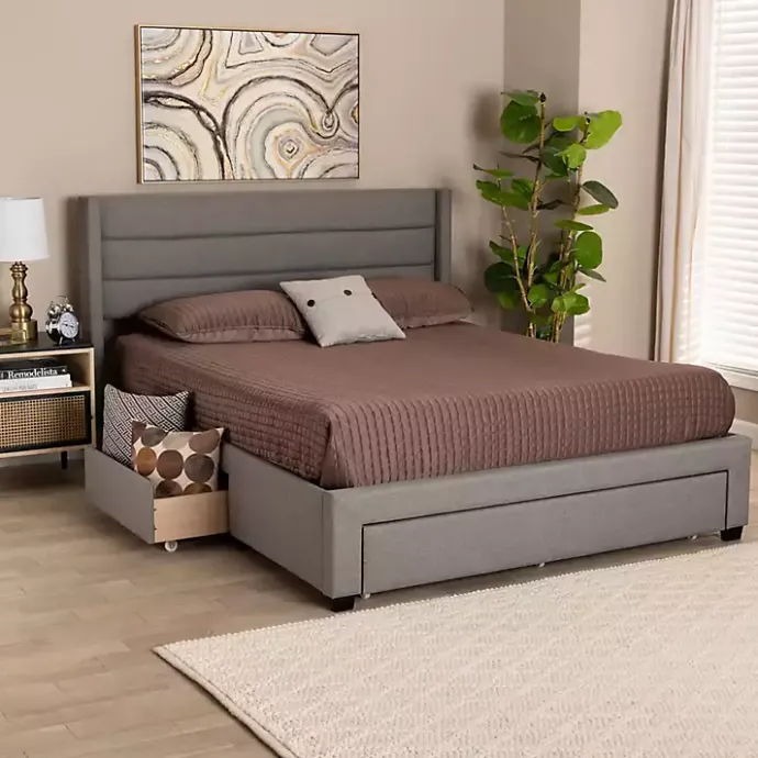 With a chic, simple style and neutral finish, this Gray Braylon Upholstered 3-Drawer Queen Bed will bring modern luxury to your bedroom. Plus, its built-in storage provides space for extra clothes, shoes, and blankets, keeping your space tidy!