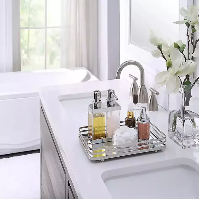Reorganize and revamp your countertop in a chic way! Our Satin Nickel Mirrored Vanity Tray is perfect for holding perfumes, jewelry, and bathroom essentials.