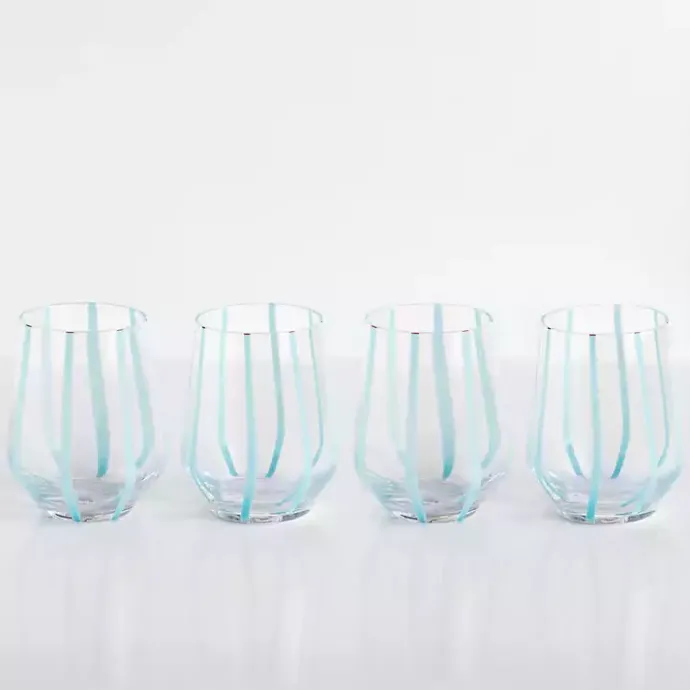 Whether you’re hosting a special brunch or a girls night in, sip on your drink of choice the set Blue Striped Stemless Wine Glasses! They’re perfect for adding a pop of color and casual charm to your glassware.