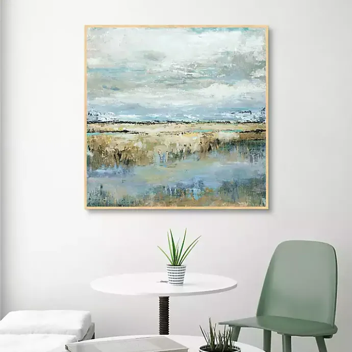 Showcasing an abstract interpretation of a tranquil river scene, the Coastal Marsh Framed Canvas Art Print will look perfect in a modern or contemporary-coastal setting.