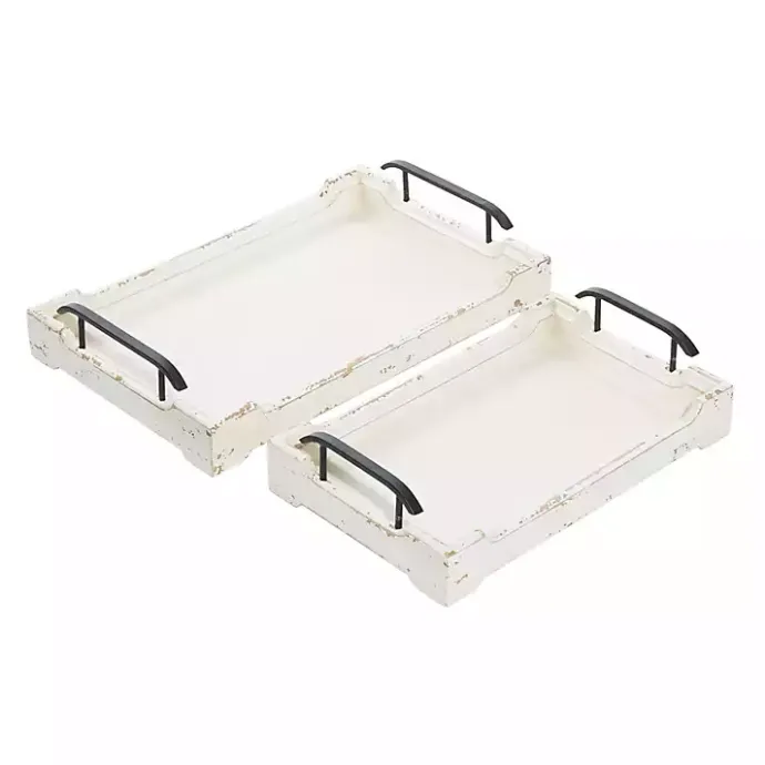 Complete your cottage with these Distressed Ivory Wood Trays. Each of the two trays are chic with their carved edges, metal handles, and antique white finish.
