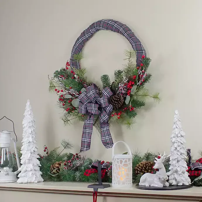 Usher holiday cheer into your home with this Gray Plaid Pine and Berries Wreath. Its charming plaid bow and seasonal foliage will brighten up any space!